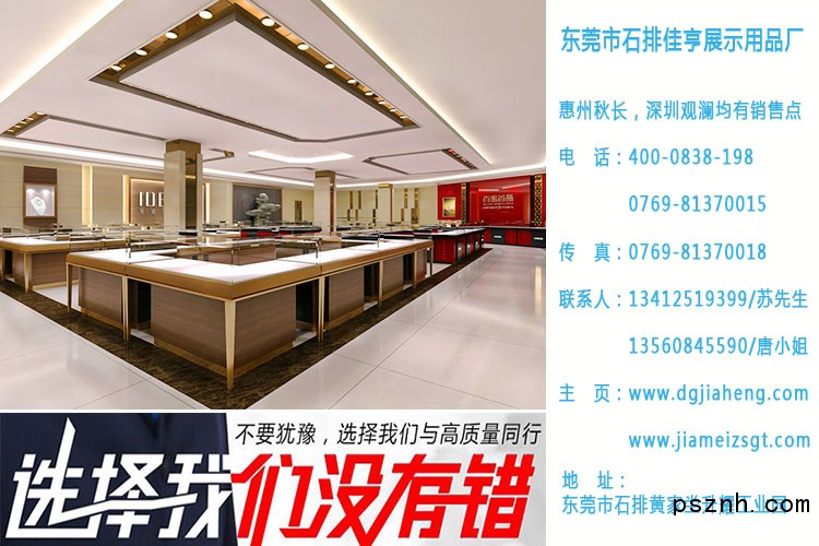 始终坚持以质量为上,诚信为本的宗旨,东莞市石排佳亨展示用品厂竭诚为需要群体提供更新更完美的产品,更符合市场需求的珠宝展示柜。更好的产品质量,更周到的服务,更合理的价格。为了您的满意,我们佳亨展示用品一直在努力!地址:石崇工业园石崇横路F区